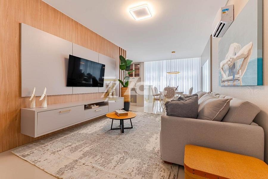 O apartamento possui 2 suítes, área de serviço, ambientes de estar, jantar e cozinha amplos e integrados, lavabo, piso em porcelanato, finamente mobiliado, espera para ar condicionado split e aquecedor de passagem, portas com fechadura eletrônica, excelente posição solar sendo bem iluminado e ventilado.